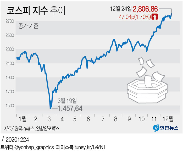 이틀 연속 상승한 코스피는 전 거래일보다 47.04포인트(1.70%) 오른 2806.86에 장을 마감하고 성탄절 연휴에 들어갔다. 종가 기준 종전 최고치(2778.68)를 사흘 만에 갈아치우며 국내 증시의 역사를 다시 썼다.