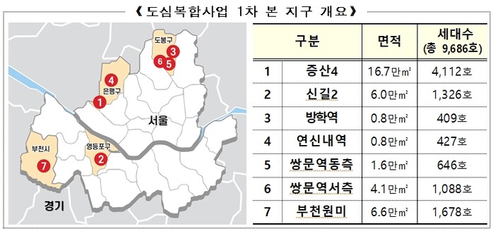 가장 규모가 큰 증산4구역의 4112호를 비롯해, 신길2 구역 1326호, 방학역 구역 409호, 연신내역 구역 427호, 쌍문역 동측 구역 646호, 쌍문역 서측 구역 1088호, 부천원미 구역 1678호 등 총 9686세대다.