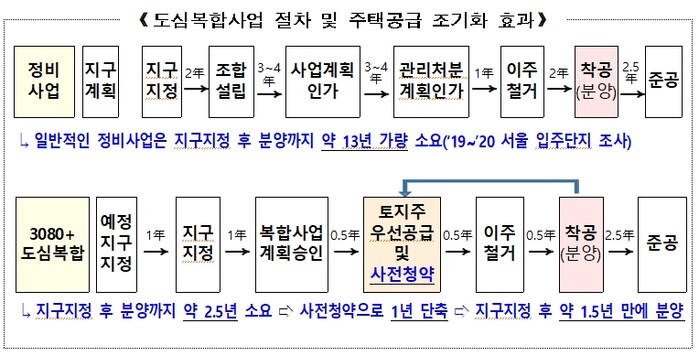 | ▲ 도심복합사업 절차 및 주택공급 조기화 효과. [국토교통부 제공] |