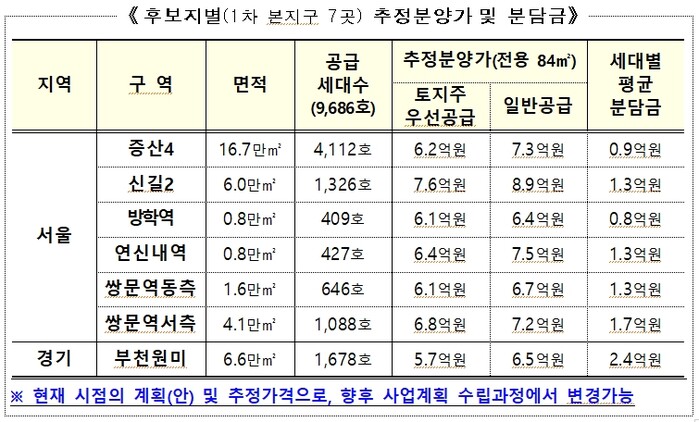 | ▲ 1차 본지구 7곳 추정분양가 및 분담금. [국토교통부 제공] |