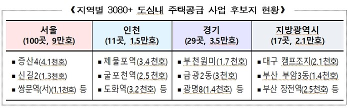 | ▲ 지역별 3080+ 도심내 주태공급 사업 후보지 현황. [국토교통부 제공] |