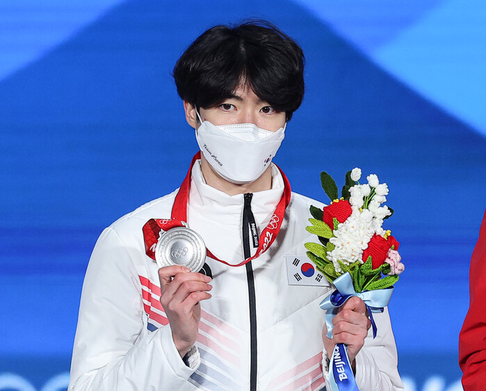 | ▲ 2022 베이징 동계올림픽 스피드스케이팅 남자 500m에서 2위를 차지한 차민규가 12일 오후 중국 베이징 메달플라자에서 열린 메달 수여식에서 은메달을 수여받은 뒤 메달을 들어 보이고 있다. [베이징=연합뉴스] |