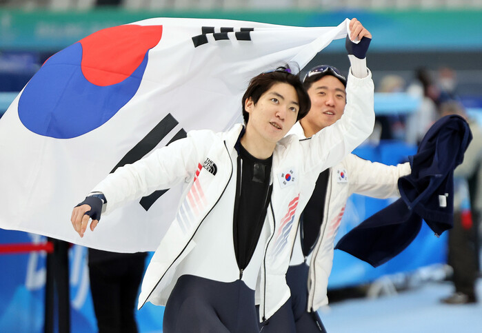 | ▲ 차민규가 12일 오후 중국 베이징 국립 스피드스케이팅 경기장(오벌)에서 열린 2022 베이징 동계올림픽 스피드스케이팅 남자 500m 경기 2위로 은메달을 획득한 뒤 동료 김준호와 함께 기뻐하고 있다. [베이징=연합뉴스] |