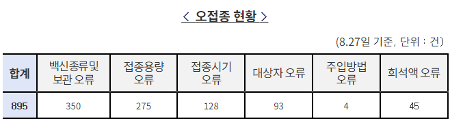 당시 세부적으로는 백신 종류 및 보관 오류(350건), 접종용량 오류(275건), 접종시기 오류(128건), 대상자 오류(93건), 희석액오류(45건), 주입방법 오류(4건) 순이었다.