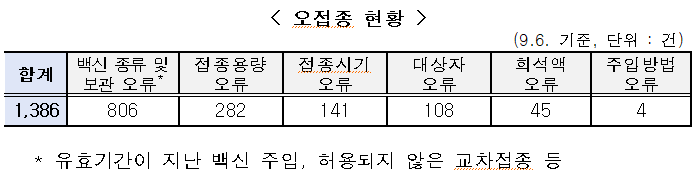 ▲ 9월 6일 0시 기준 백신 오접종 현황. [출처=코로나19 예방접종대응추진단] |