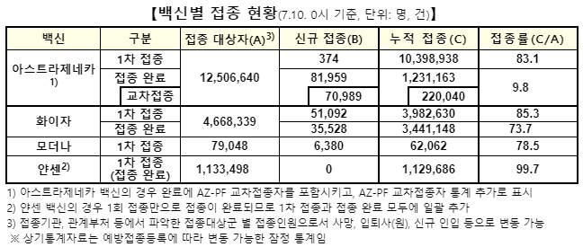 ▲ 10일 0시 기준 코로나19 백신별 접종 현황. [출처=코로나19 예방접종 대응 추진단] |
