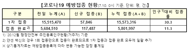 추진단에 따르면, 10일 0시 기준으로 전날 새롭게 5만7846명이 1차 코로나19 백신을 맞았다. 이로써 누적 1차 접종자는 1557만3316명으로 인구 대비 접종률은 30.3%를 기록했다.