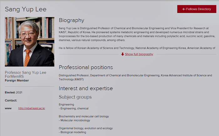 ▲ 영국 왕립학회의 외국 회원으로 선임된 이상엽 교수 소개란. [출처= 영국 왕립학회 사이트 캡처] |