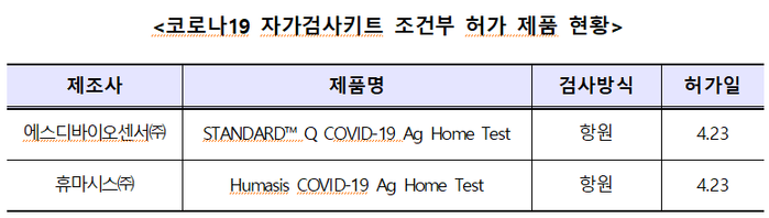 ▲ 코로나19 자가검사키트 조건부 허가 제품 현황. [출처= 식품의약품안전처] |