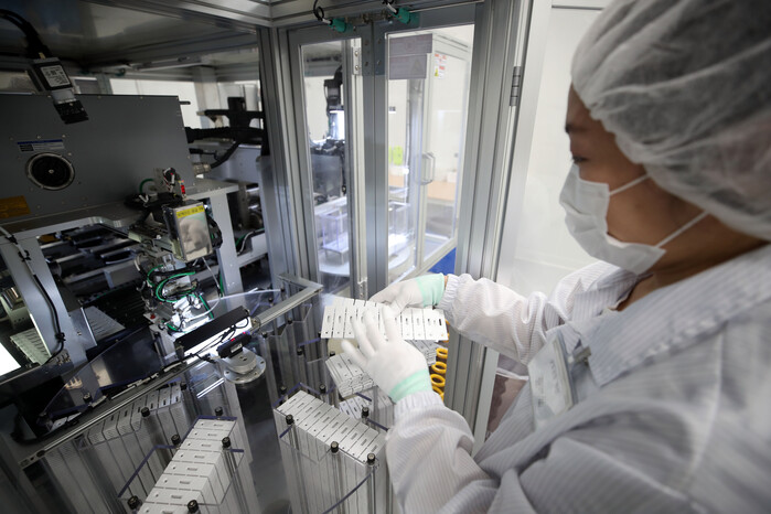 ▲ 3일 오후 경기도 휴마시스 군포공장에서 코로나19 자가 진단키트가 생산되고 있다. [사진= 연합뉴스] |