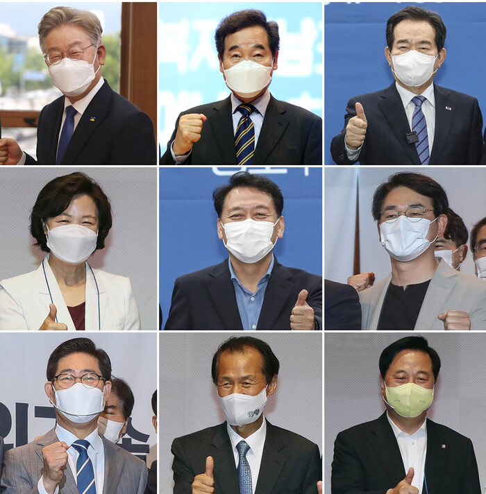 ▲ 더불어민주당 제20대 대통령선거 경선에 나서는 9명의 예비후보들. 사진 맨 윗줄 왼쪽부터 이재명 경기도지사, 이낙연 전 대표, 정세균 전 국무총리. 두 번째줄 왼쪽부터 추미애 전 법무부 장관, 이광재 의원, 박용진 의원. 사진 맨 아래 왼쪽부터 양승조 충남도지사, 최문순 강원도지사, 김두관 의원. [사진=연합뉴스] |