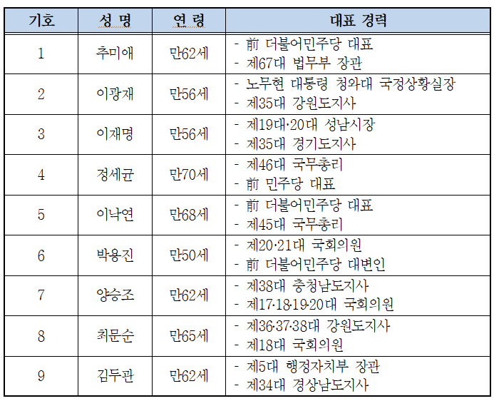 민주당 예비경선 후보들의 기호 추첨 결과를 보면, 1~9번에 각각 추미애(62), 이광재(56), 이재명(56), 정세균(70), 이낙연(68), 박용진(50), 양승조(62), 최문순(65), 김두관(62) 순이다.