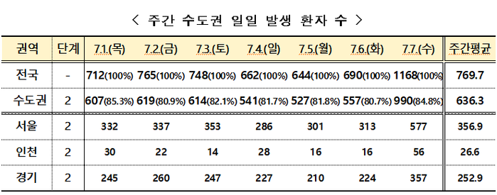 7일 0시 기준으로 신종 코로나바이러스 감염증(코로나19) 신규 확진자 1212명 중 국내 지역발생 환자는 1168명이었고, 이중 수도권 환자는 990명, 서울은 577명이었다. 특히 수도권과 서울 환자의 경우 코로나 유행 이후 가장 많은 숫자이다.