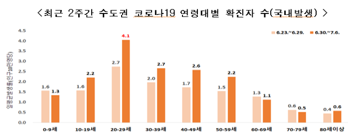 ▲ 최근 2주간 수도권 코로나19 연령대별 확진자수(국내발생). [출처=중앙재난안전대책본부] |