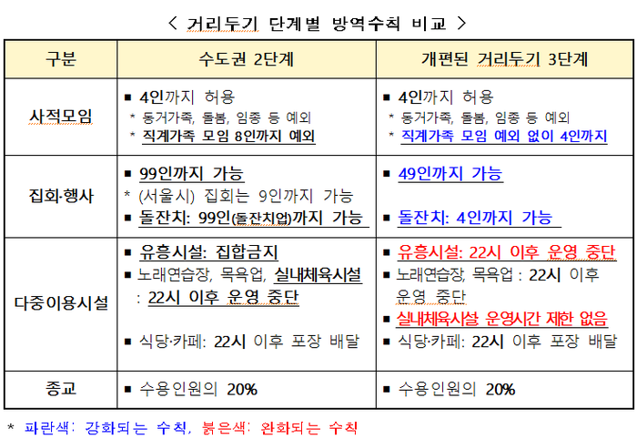 ▲ 거리두기 단계별 방역수칙 비교. [출처=중앙재난안전대책본부] |