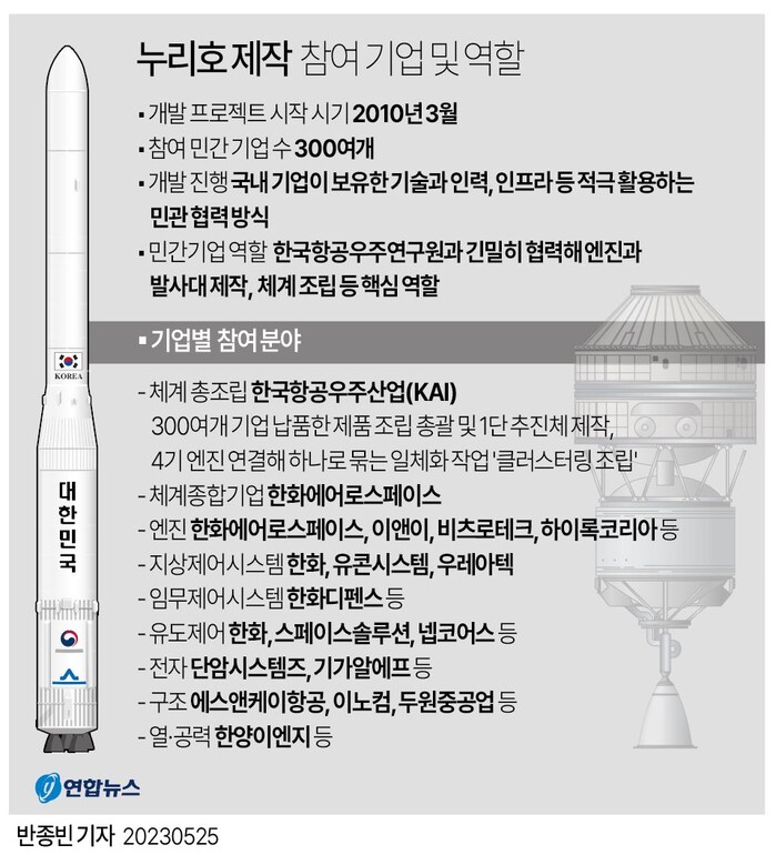 ▲ 25일 한국형 발사체 누리호(KSLV-Ⅱ)가 우주를 향해 힘차게 솟아오를 수 있었던 원동력에는 국내 민간기업의 최첨단 기술도 한몫을 했다. 설계와 제작, 시험, 발사 등 모든 과정이 순수 국내 기술로 진행된 누리호 개발에는 국내 민간 기업 300여곳이 참여했다. [그래픽=연합뉴스] |