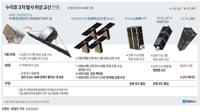 민간산업체 큐브위성 3기 중에선 당일 신호를 확인한 루미르 'LUMIR-T1'과 카이로스페이스 'KSAT3U'가 현재 운용 모드로 들어간 상태다. LUMIR-T1은 현재 배터리 충전 모드로 운용 중이며, KSAT3U는 26일 오후 2시 40분께 양방향 교신에도 성공했다.