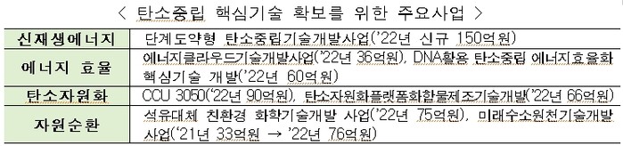 ▲ 탄소중립 핵심기술 확보를 위한 주요사업. [과학기술정보통신부 제공] |