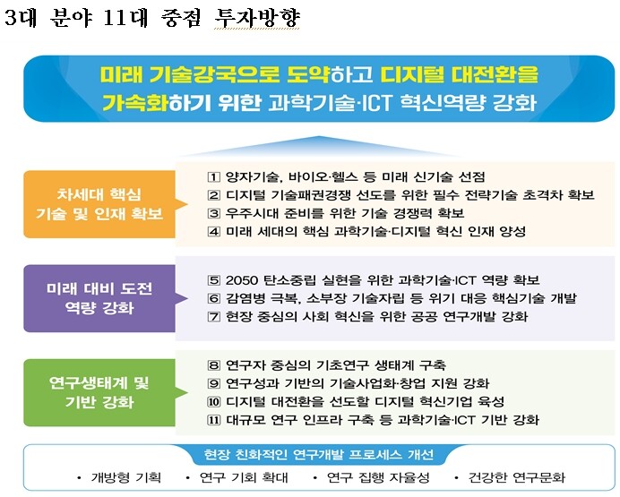 ▲ 과기부 올해 연구개발사업 3대 분야 11대 중점 투자방향. [과학기술정보통신부 제공] |