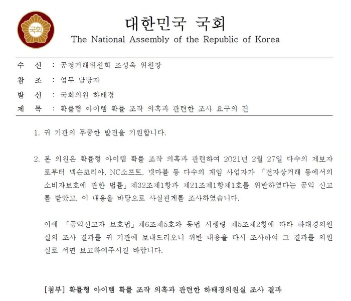 한편, 지난 16일 하 의원은 공정거래위원회에 확률형 아이템 확률 조작 의혹 관련 조사를 요구한 바 있다.