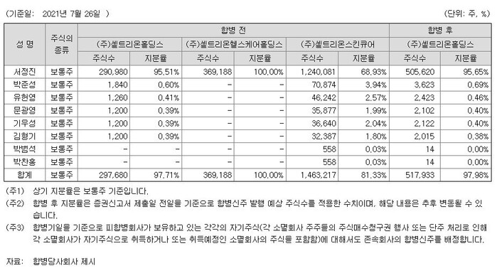 합병 후 셀트리온홀딩스는 셀트리온 지분 22.1%, 셀트리온헬스케어 25.7%를 보유하게 된다. 셀트리온은 셀트리온제약 지분 55%를 가지고 있다.