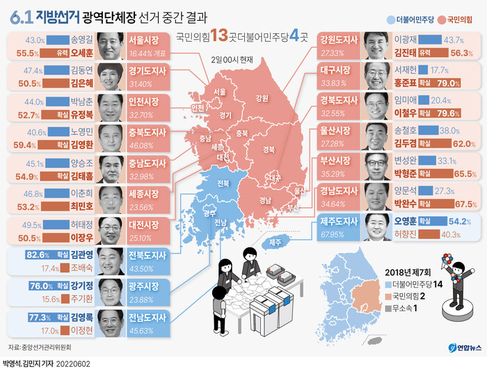 6·1 지방선거의 17개 시·도 광역단체장 선거에서 2일 새벽 1시 현재 중간 개표 결과 서울을 비롯한 13곳에서 국민의힘이 우위를 이어가며 4년 전 선거 때와는 정반대로 압승을 거둘 것으로 전망되고 있다.
