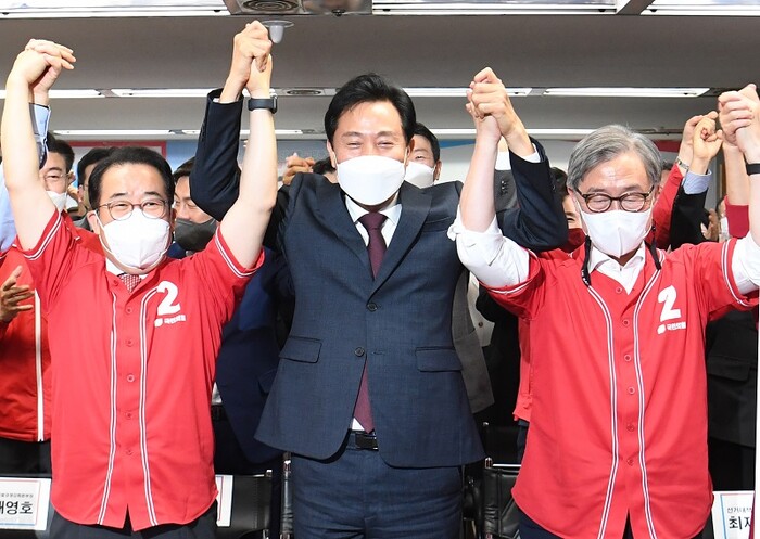 반면, 민주당 소속 광역단체장 후보들은 17개 시도 중 광주시장 강기정 후보(75.17%), 전남지사 김영록 후보(76.73%), 전북지사 김관영 후보(82.45%), 제주지사 오영훈 후보(54.63%) 등 4곳에서만 당선이 확실시되고 있다.