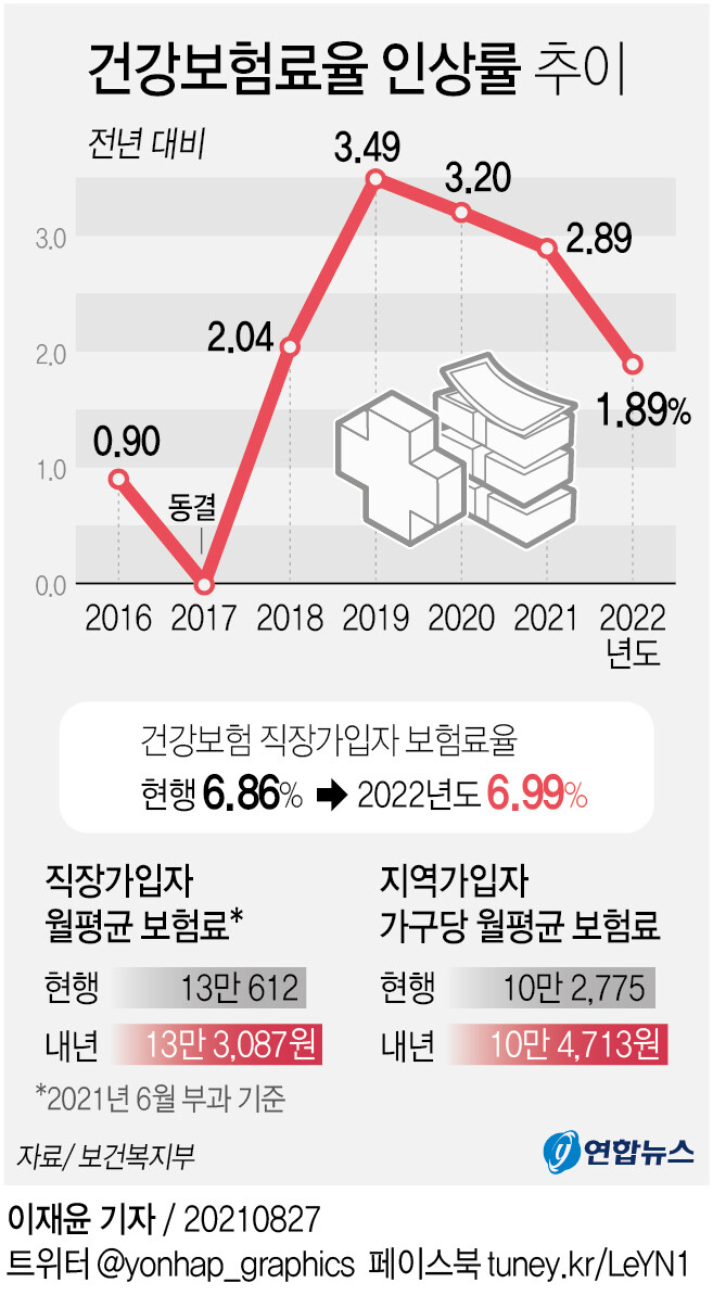 보건복지부는 26일 ‘2021년 제19차 건강보험정책심의위원회’를 열고 2022년도 건강보험료율을 1.89% 올리기로 결정했다고 27일 밝혔다.