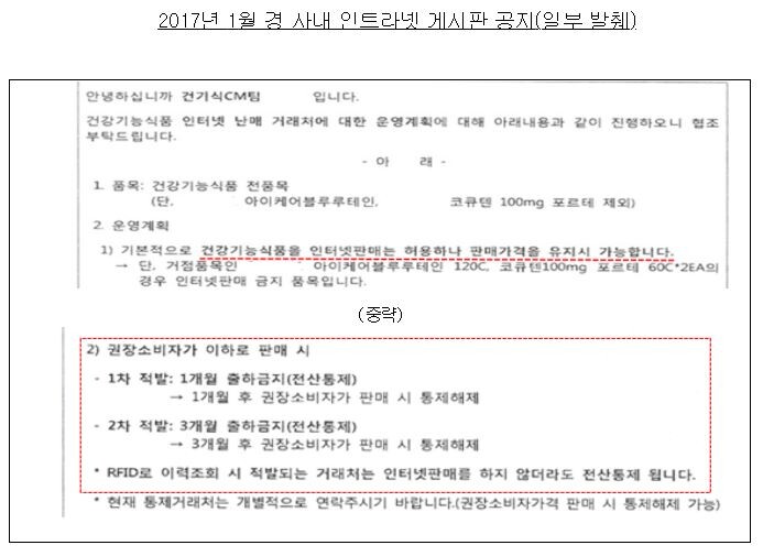 일동제약이 자사 약국유통용 건강기능식품의 소비자 판매가격을 정하고, 약국이 온라인에서 판매할 경우 싸게 팔지 못하도록 가격을 통제한 사실이 적발됐다.