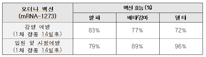 모더나 백신 1차 접종 후 변이 바이러스에 대한 입원 및 사망예방 효과는 델타 변이가 96%로 보고됐다. 알파 변이는 79%, 베타·감마 변이는 89%였다.