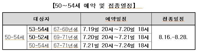또, 7월 21일 오후 8시부터 7월 24일 오후 6시까지는 50-54세 연령층 전체가 예약이 가능하다.
