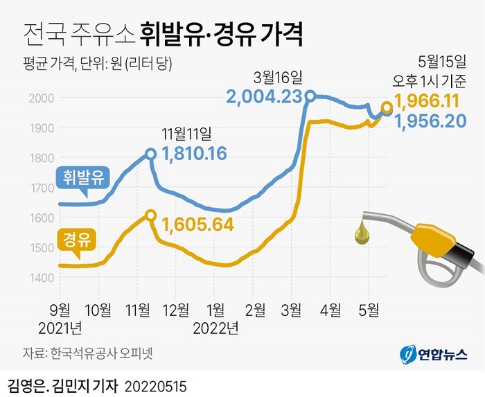 | ▲ 전국 주유소 휘발유와 경유 가격 추이. [그래픽=연합뉴스] |