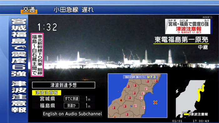 | ▲ 16일 밤 일본 동일본 후쿠시마 태평양해역 앞바다서 규모 7.3 강진이 발생했다. 사진은 강진 발생에 따른 지역별 진도와 후쿠시마 제1원전의 모습을 비추는 NHK 영상 화면. [NHK 생방송 화면 캡처] |