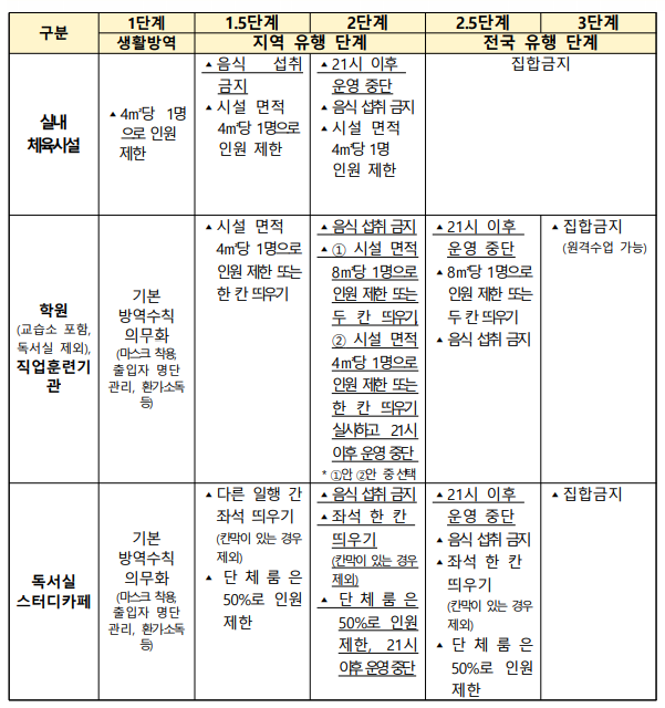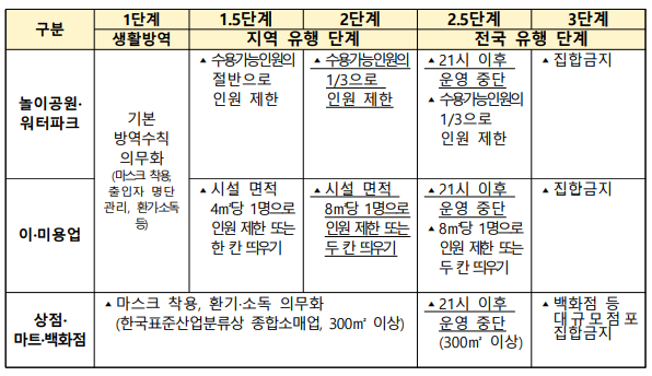 전국 유행 단계인 2.5단계와 3단계에서는 전국적으로 방문판매 등 직접판매홍보관, 노래연습장, 실내 스탠딩공연장 등은 집합금지하며, 식당은 21시 이후 포장·배달만 허용한다.