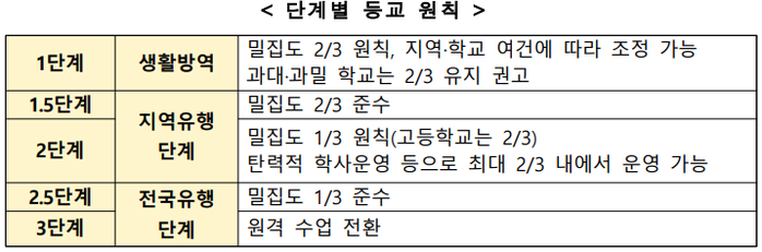 등교는 2.5단계까지는 등교 밀집도를 조정하고, 3단계부터 원격수업으로 전환하는 것을 원칙으로 한다.