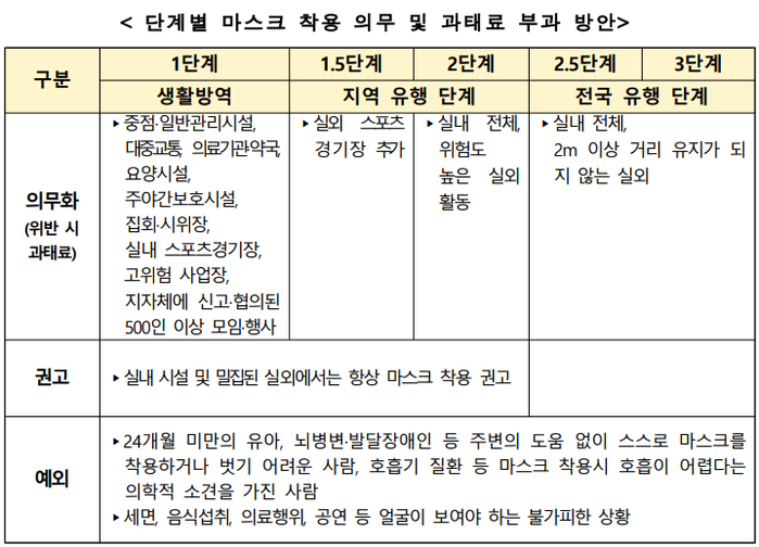 ▲ 단계별 마스크 착용 의무 및 과태료 부과 방안. [출처= 충앙재난안전대책본부] |