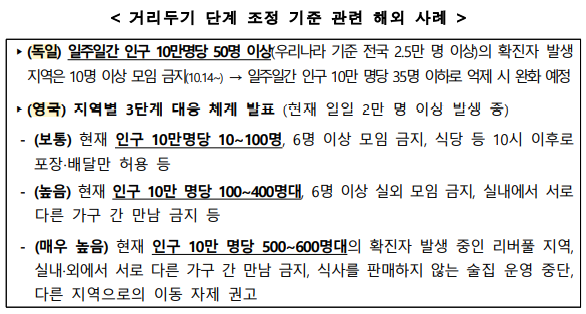 ▲ 거리두기 단계 조정 기준 관련 해외 사례. [출처= 중앙재난안전대책본부] |