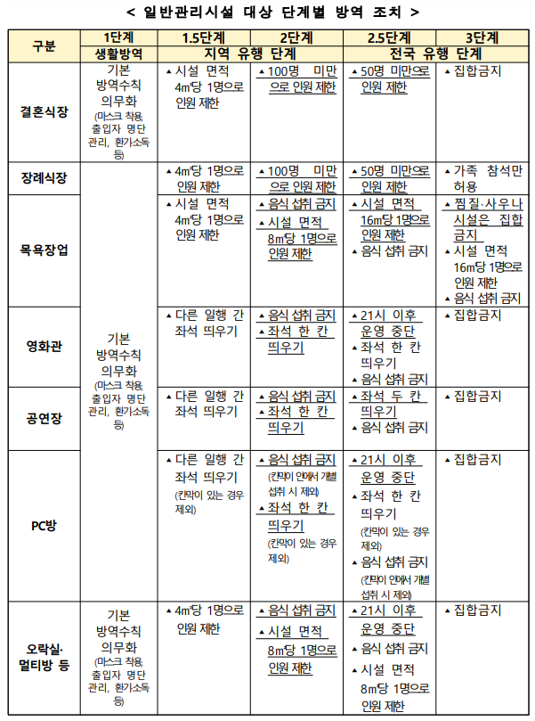 ▲ 일반관리시설 대상 단계별 방역 조치 [출처= 충앙재난안전대책본부] |