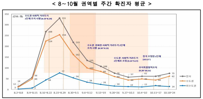 ▲ 8~10월 권역별 주간 확진자 평균. [출처= 충앙재난안전대책본부] |