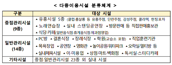 중점관리시설 9종은 ▴클럽 등 유흥주점 ▴단란주점 ▴감성주점 ▴헌팅포차 ▴콜라텍 ▴노래연습장 ▴방문판매 등 직접판매홍보관 ▴실내 스탠딩공연장 ▴식당·카페(일반음식점·휴게음식점·제과점영업, 150㎡ 이상)이다.