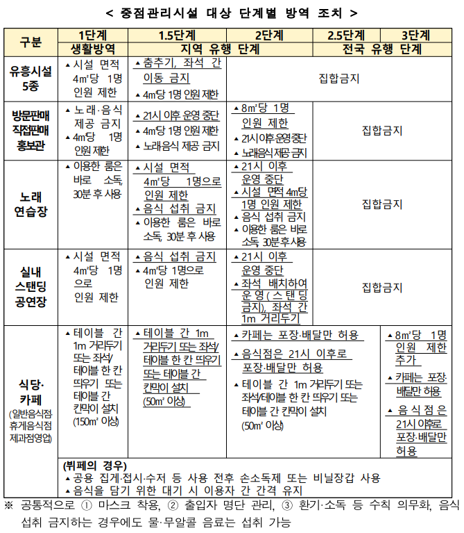 ▲ 중점관리시설 대상 단계별 방역 조치. [출처= 충앙재난안전대책본부] |