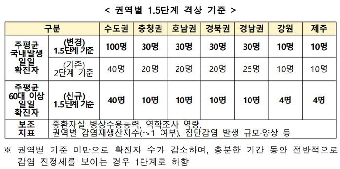 권역별 중증환자 병상 여력을 고려해, 주평균 국내발생 일일 확진자가 수도권 100명 이상, 충청·호남·경북·경남권 30명 이상, 강원·제주도는 10명 이상일 경우 해당 권역을 1.5단계로 올리게 된다.
