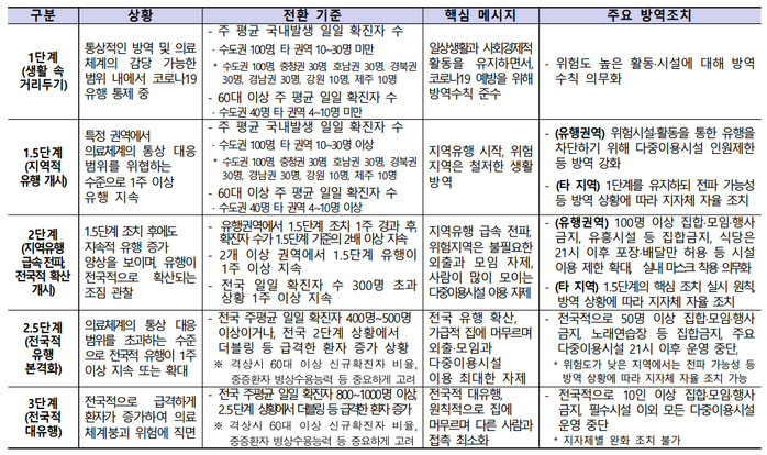 이에 따라 생활방역(1단계), 지역 유행(1.5, 2단계), 전국 유행(2.5, 3단계) 상황을 각각 상정해 3단계 체계를 설계하고, 지역 유행 상황인 2단계까지는 유행 권역을 중심으로 단계를 격상하고 방역을 강화한다.