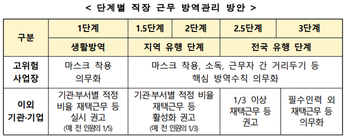 ▲ 단계별 직장 근무 방역관리 방안. [출처= 충앙재난안전대책본부] |