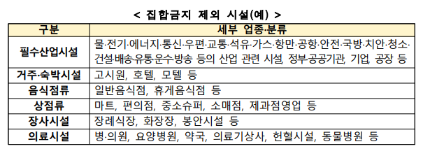 ▲ 집합금지 제외 시설. [출처= 중앙재난안전대책본부] |