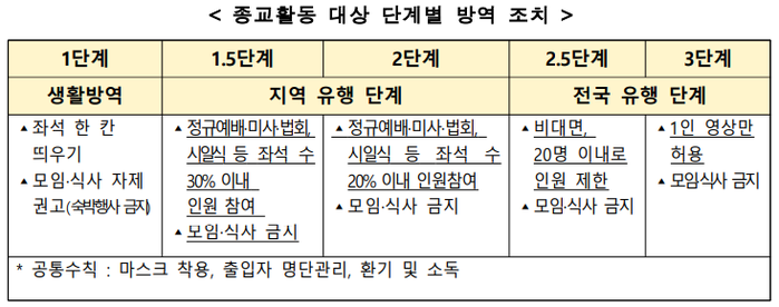 ▲ 종교활동 대상 단계별 방역 조치. [출처= 충앙재난안전대책본부] |