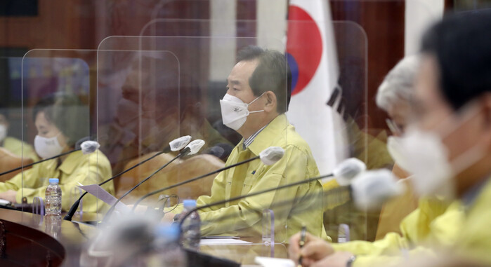 ▲ 정세균 국무총리가 1일 오후 서울 세종로 정부서울청사에서 열린 코로나19 대응 중앙재난안전대책본부회의에서 발언하고 있다. [사진= 연합뉴스] |