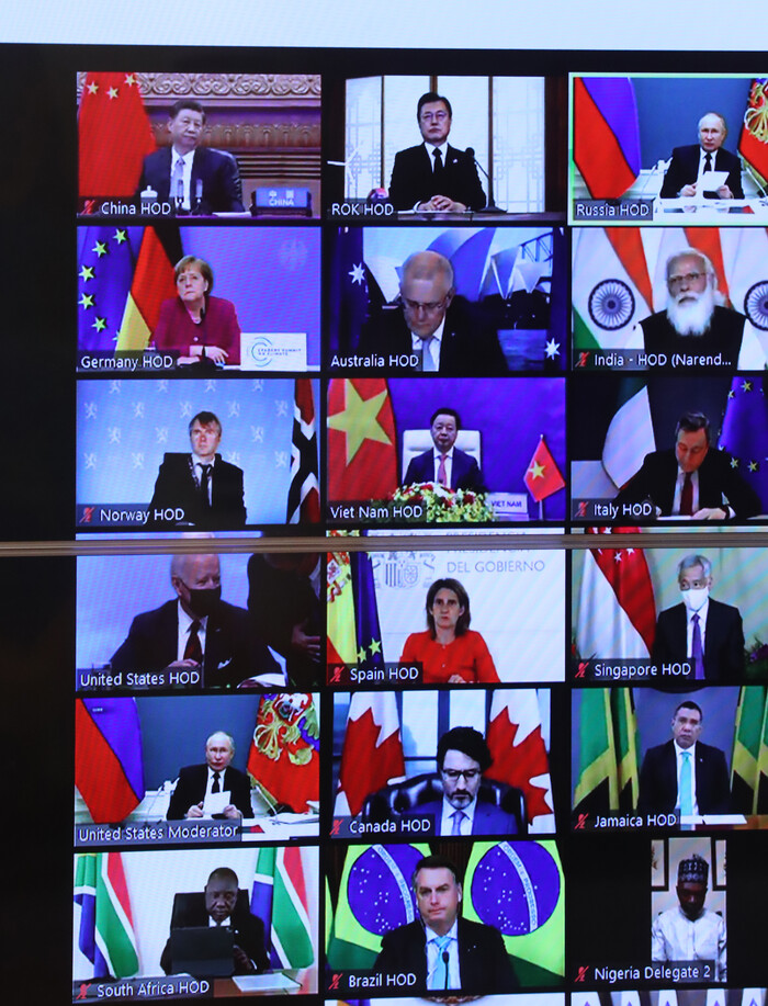 ▲ 22일 청와대 상춘재에서 화상으로 열린 기후정상회의에 문재인 대통령(위 가운데), 조 바이든 미국 대통령(왼쪽 위에서부터 네번째), 시진핑 중국 국가주석(왼쪽 위), 블라디미르 푸틴 러시아 대통령(오른쪽 위)등 각국 정상들이 보인다. [서울= 연합뉴스]. |