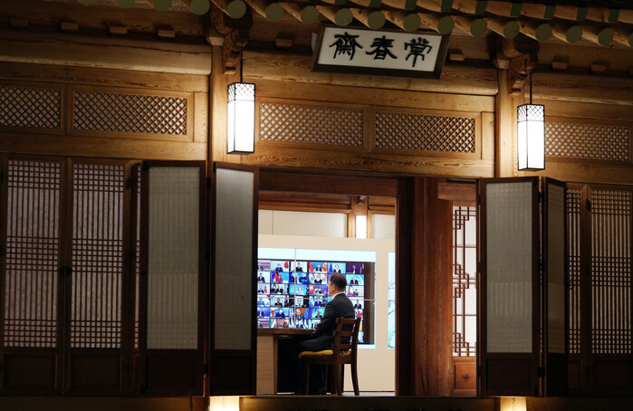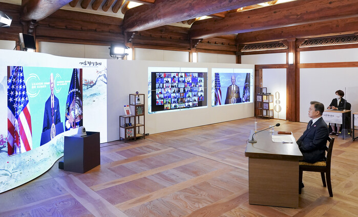 문 대통령은 이날 청와대 상춘재에 마련된 화상회의장에서 기후정상회의에 임했다. 이곳은 디지털기술과 전통을 융합한 한국형 서재 스타일로 꾸며졌으며, 전통한옥인 상춘재 대청마루를 활용, 최첨단 차세대 디스플레이(T-OLED)를 배치했다.