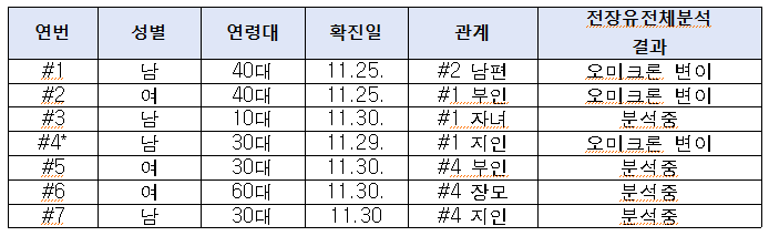현재 40대 부부의 자녀 1명 외에, 부부 지인의 아내, 장모, 또다른 지인 등 3명에 대한 오미크론 변이 전장 유전체 분석도 진행 중이다.